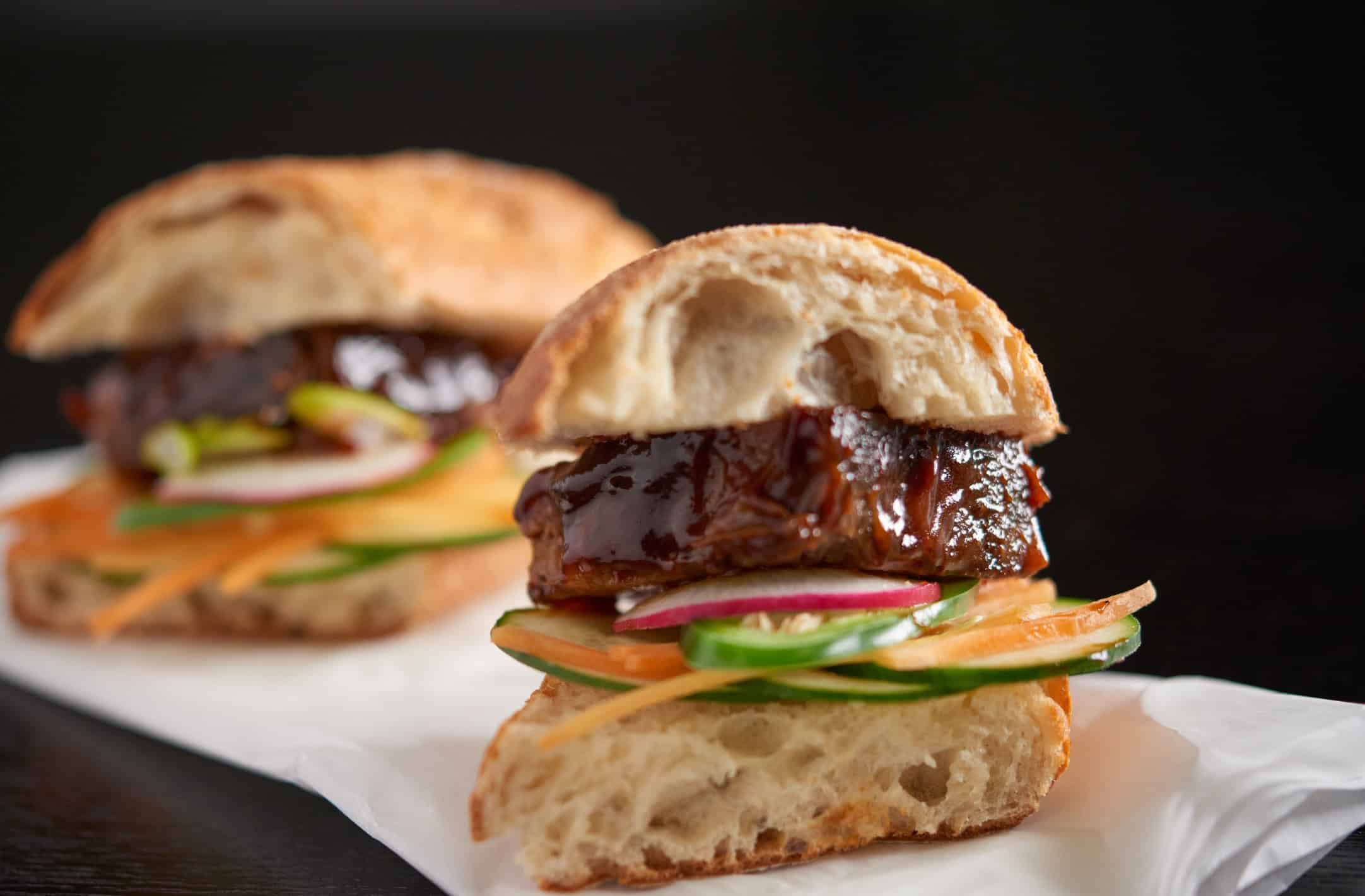 Our Bahn Mi Sandwiches will make you squeal with delight. The fiery seasoned meat, the tangy Lemongrass aioli and bright pickled vegetables will make your mouth sing. Our clients love them so much we have decided to spread the joy (and recipe) this holiday season. We used the Cuisinart PrepExpress for our Spiralized Pickled Vegetables and it made the work a snap!