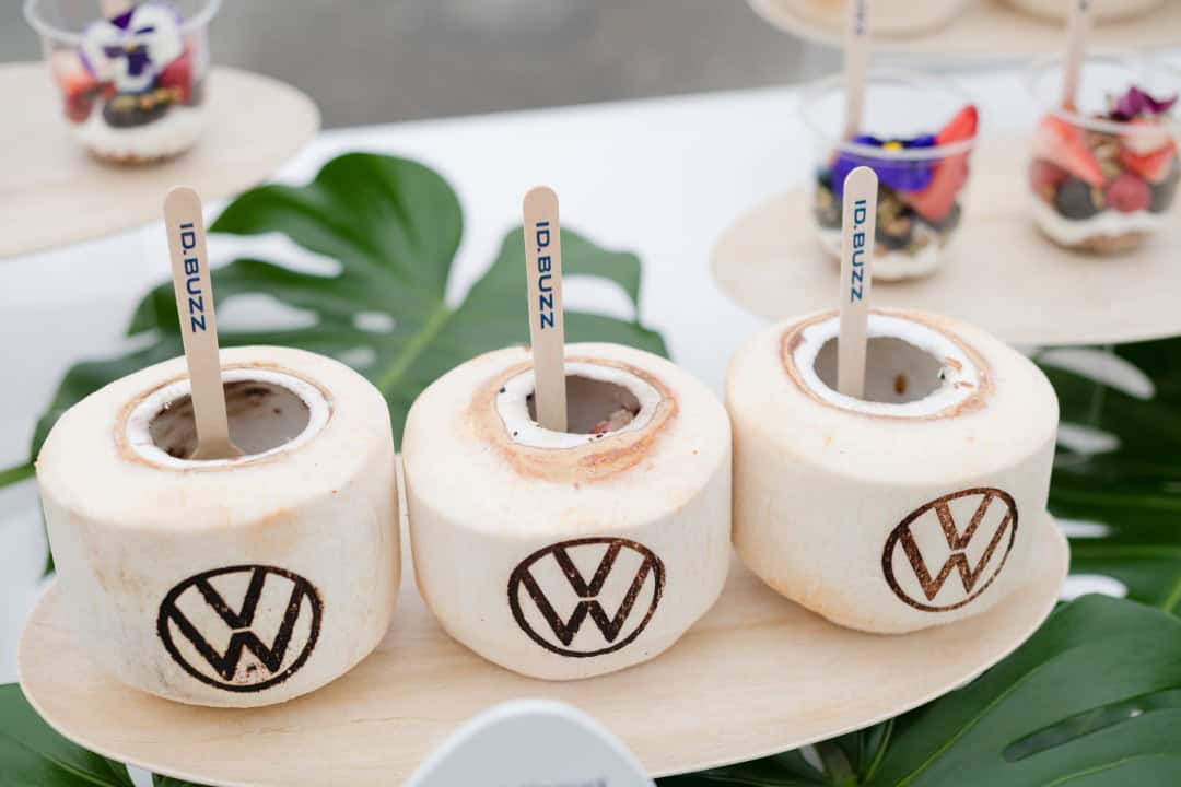 Logo Mania: Our recent collaboration with Volkswagen (for the unveiling of the new ID Buzz bus) was an excellent opportunity for brand communication. Every food item displayed the VW logo, turning the meal into a visual prop in posts generated by influencers and attendees alike,  The event was a beach-themed celebration, and the branding was seamlessly woven into every aspect, from the carved watermelons and VW-adorned husk coconut bowl to the logo-branded breakfast burgers. Corporate events often feature influencer guests, and leveraging interactive catering not only captivates your audience but also encourages them to share their experiences, making your event “go viral.”